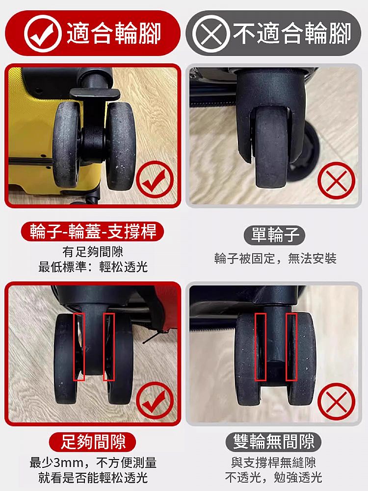 - 延長行李輪壽命,減少輪子磨損