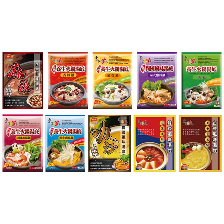 - 正宗川味湯底(四川麻辣包)/養生火鍋湯底(香辣/菌菇/清香/泰式酸辣/田園蕃茄/黃金南瓜/Laksa叻沙)/韓式風味湯底(泡菜大醬鍋)/台式風味湯底(黃金泡菜鍋)