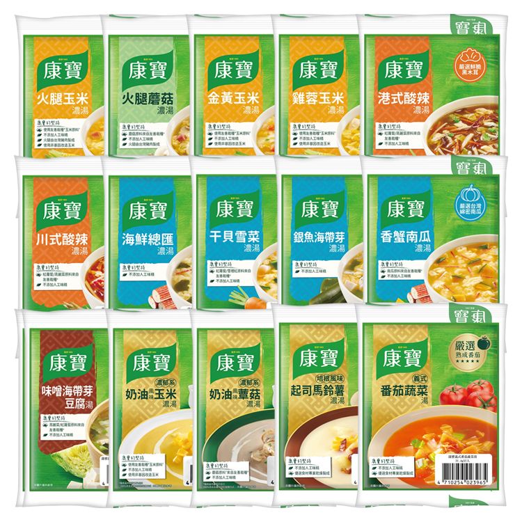 - 火腿玉米/火腿蘑菇/金黃玉米/雞蓉玉米/港式酸辣/川式酸辣/海鮮總匯/干貝雪菜/銀魚海帶芽/香蟹南瓜/香菇雞蓉/味噌豆腐湯/奶油風味玉米/奶油風味蕈菇/培根風味起司馬鈴薯/義式番茄蔬菜
