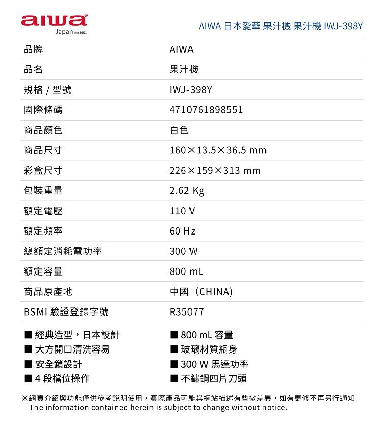 aiwa 愛華~800ml果汁機(IWJ-398Y)1入