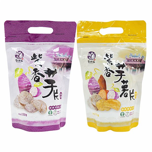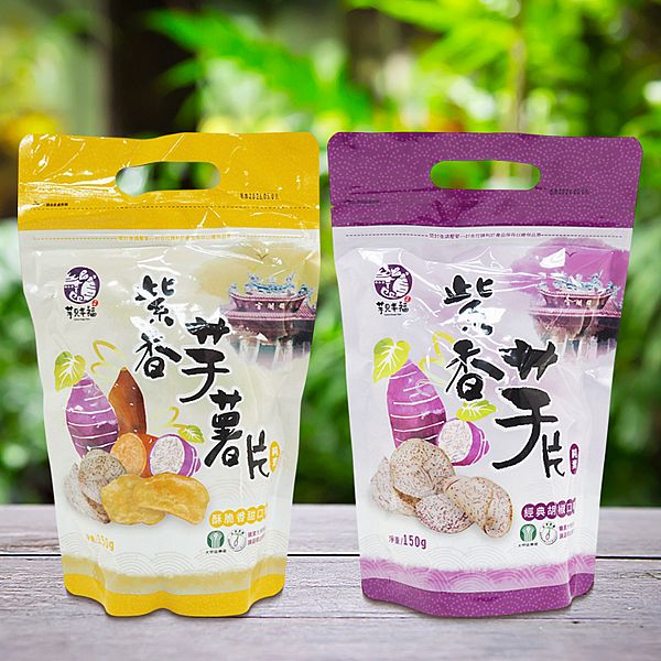 - 紫香芋薯片:香氣濃郁的大甲芋頭搭配金黃香甜的番薯簡單樸實的經典美味,薄脆爽口、自然好吃!