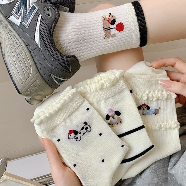 - 中筒襪/襪子/可愛小狗中筒襪/花邊堆堆襪/日系中筒襪/女生中筒襪/百搭襪子/小狗圖案襪/堆堆中筒襪/彈性透氣襪/親膚不勒腳/甜美花邊襪/休閒日常穿搭襪