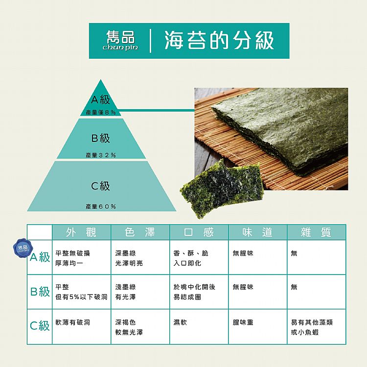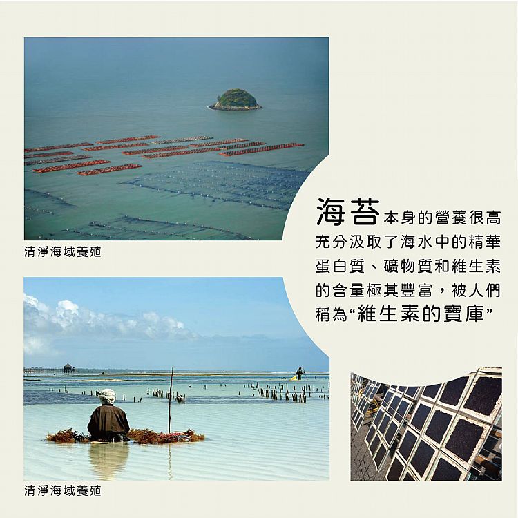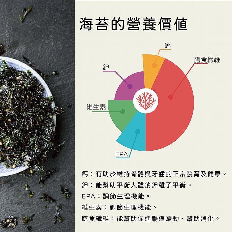 - 採用韓國菀島A級紫菜製作口感香、酥、脆,入口即化