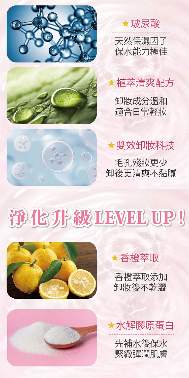 - 卸妝同時保養肌膚,帶妝一整天仍保持肌膚水嫩細緻