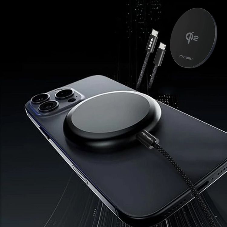 Polywell 寶利威爾~Qi2無線磁吸充電盤組(C-C編織線1M)15W(1組入)