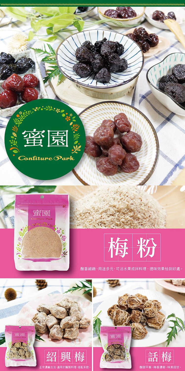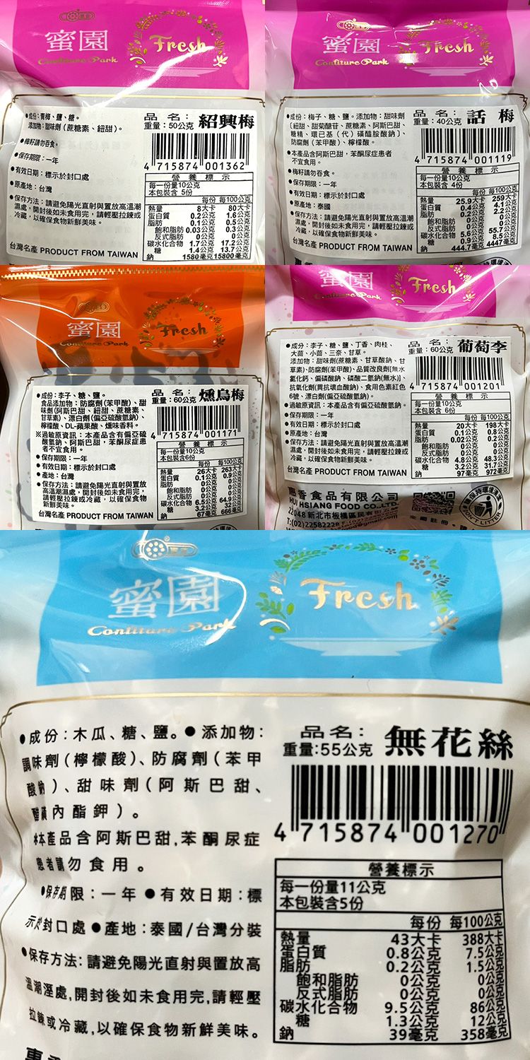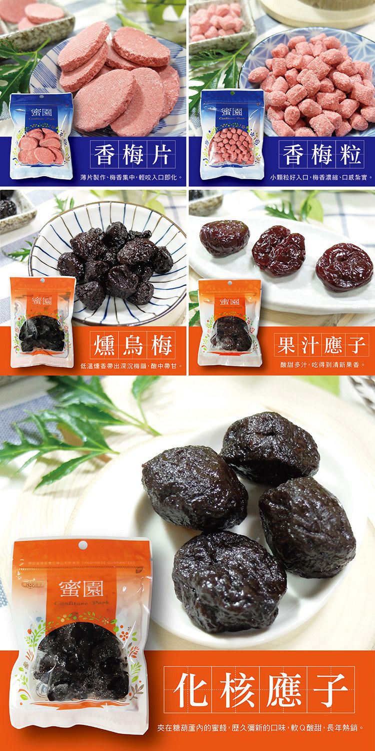 - 話梅/紹興梅/梅粉/甘草李/燻烏梅/正酒李/葡萄李/草莓李/果汁應子/化核應子/香梅片(粒)/香梅粒/無花絲