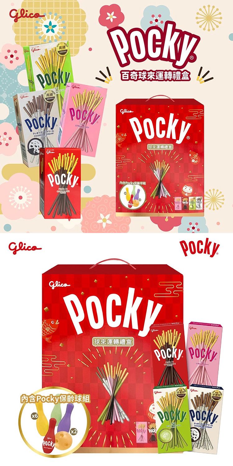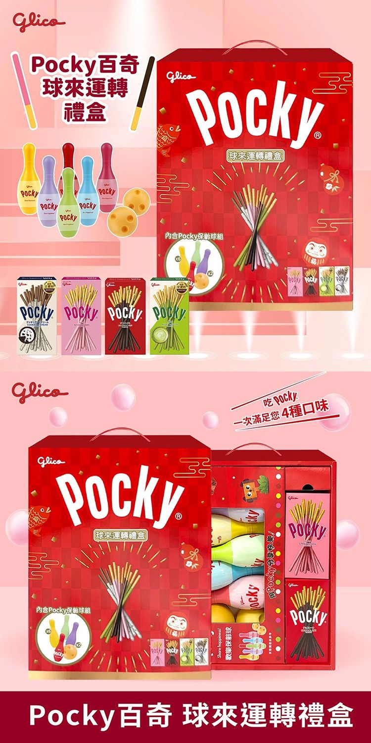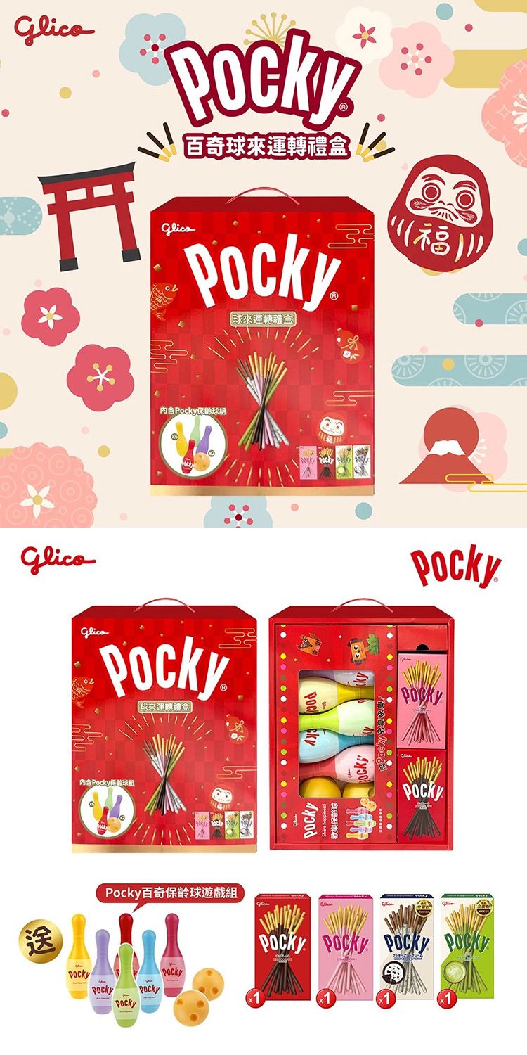 - 甜點遊戲 一次滿足! 禮盒內附獨家 Pocky 保齡球組,讓你在享用美味零食的同時,也能和家人朋友來場趣味競賽,共度一個趣味滿分的新年!