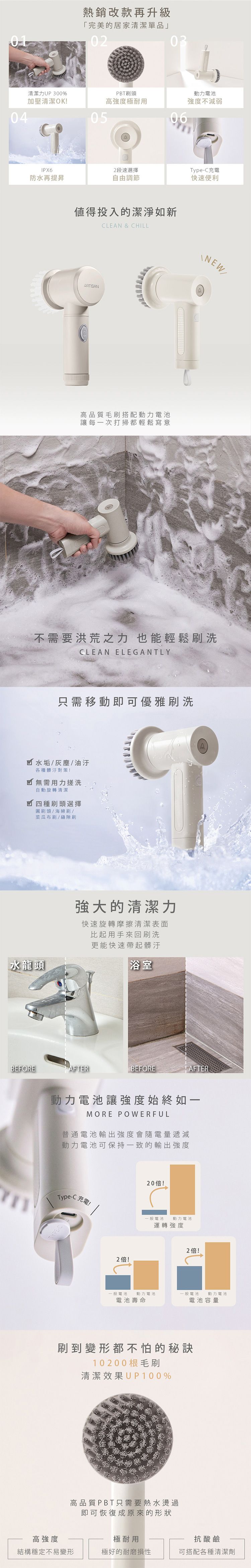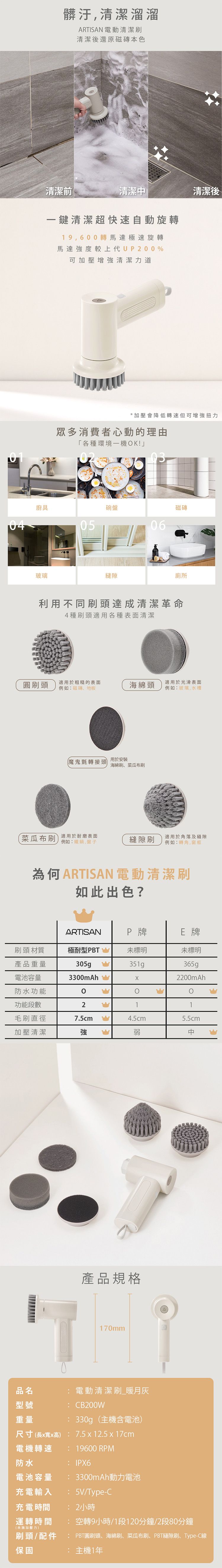 ARTISAN 奧堤森~USB充電式電動清潔刷(CB200W)暖月灰(1入)
