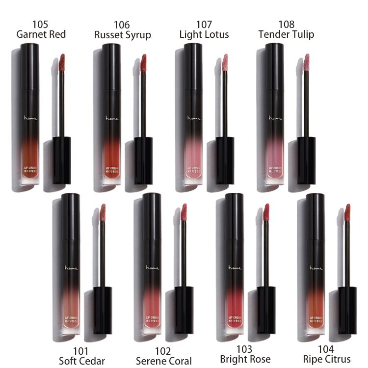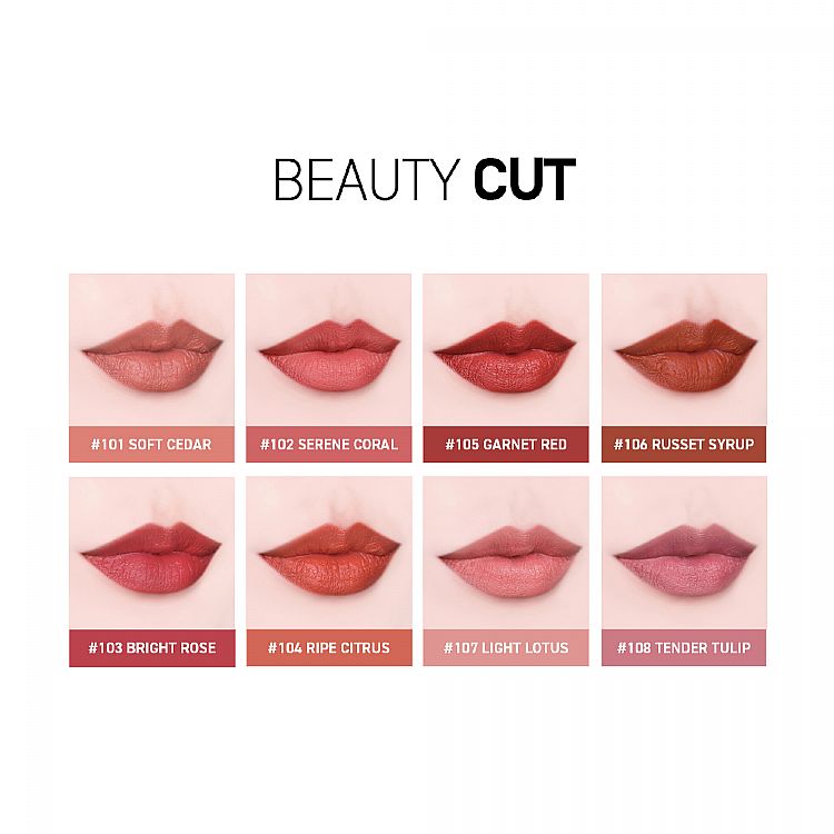 - 101 Soft Cedar/102 Serene Coral/103 Bright Rose/104 Ripe Citrus/105 Garnet Red/106 Russet Syrup/107 Light Lotus/108 Tender Tulip